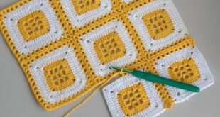 Perfect! 🌼 This crochet project is made of granny squares with a modern solid-square style (yellow + white). They are then joined together (probably with join-as-you-go or whip stitch). Here’s a step-by-step guide to make this: 🧶 Materials Yarn: 2 colors (yellow + white). Medium weight. Crochet hook (3.5–4 mm, …