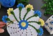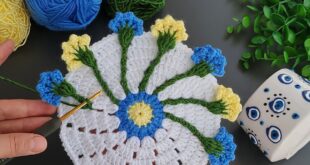 That’s a lovely floral crochet design 🌸The project in the photo is a round crochet motif with raised flower stems and 3D flowers.Here’s a step-by-step guide to make a similar piece: 🧶 Materials Needed 4 colors of yarn: white (background), green (stems), yellow (flower center), and blue or yellow (petals) …