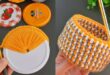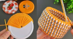 That’s a fun and creative crochet project! 🧡🤍crochet basket or container made using a plastic lid as a base and a mosaic/waffle-style stitch for the sides.This is a popular technique for making storage baskets, pen holders, or plant pot covers. Here’s a step-by-step crochet pattern to make exactly this type …