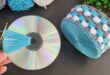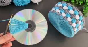 That’s a beautiful and clever crochet project! 💙✨You’re looking at a crochet basket made using a CD as a base, wrapped with yarn and then worked upward in a puff stitch / cluster stitch pattern. This technique is great for making pen holders, storage baskets, or decorative containers.Here’s the step-by-step …