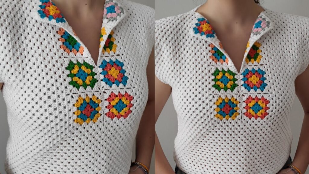 This crochet top is made using granny squares combined with granny stitch panels (clusters of 3 double crochets). Below is a full pattern guide so you can recreate it: